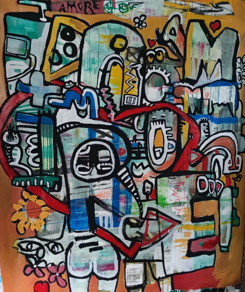 Das Werk ist eine Explosion aus Farbe, Zeichen und Schriftfragmenten – ein vibrierendes System, das Liebe, Bewegung und kreatives Chaos in ein malerisches Gleichgewicht bringt.