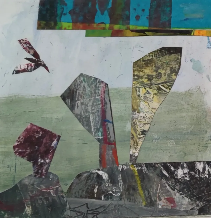 Die geometrischen Collagefragmente am unteren Bildrand erinnern an Felsen oder Figuren, während ein Vogel am linken Rand in den offenen Raum hinausschneidet.