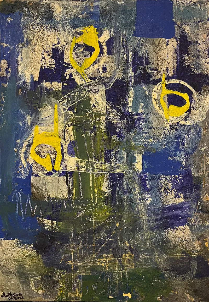 Beim Arbeiten war mir wichtig, dass das Bild nicht stillsteht. Es sollte ein bewegtes System sein, in dem sich Farbe und Form gegenseitig antreiben. Die Gelbtöne brechen für mich wie Klang durch das Blau, fast wie Signale oder Rufe. Aus den Schichten entstehen Formen, die an Gesichter, Helme oder archetypische Zeichen erinnern – ohne sich festzulegen.