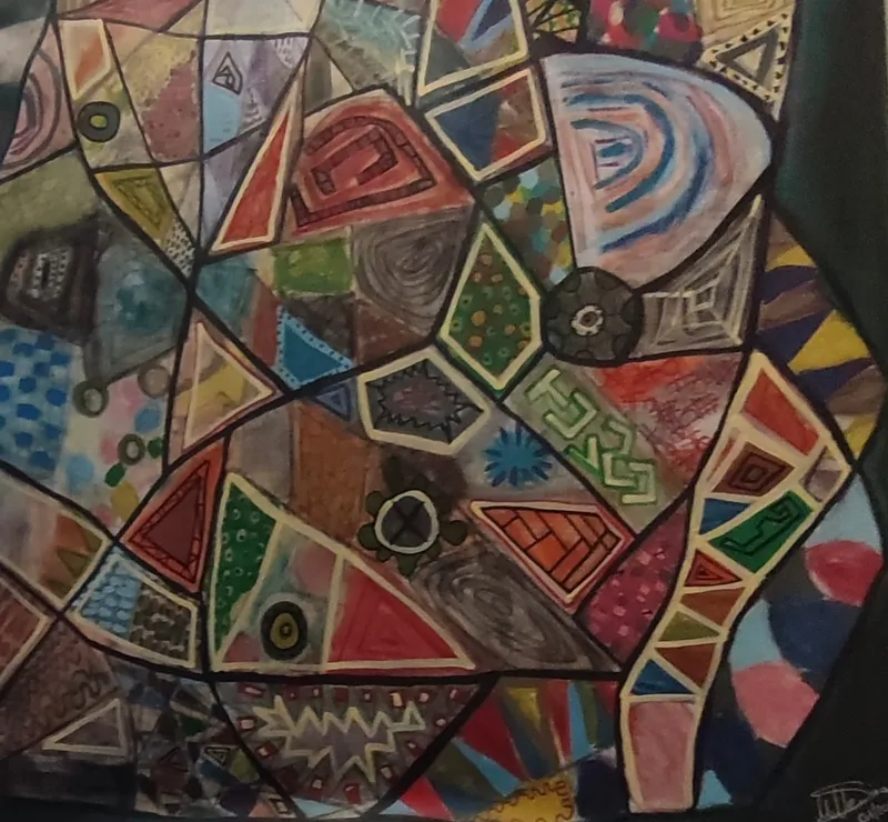 Ich arbeite mit geometrischen Flächen, Symbolen und ornamentalen Zeichen, die sich zu einem vibrierenden Ganzen fügen. Jede Form trägt für mich eine Bedeutung – eine Erinnerung, eine Begegnung, ein Moment. Beim Betrachten darf sich der Blick verlieren, so wie sich auch Erinnerungen nicht linear ordnen lassen, sondern in Rhythmen, Überlagerungen und Brüchen existieren.