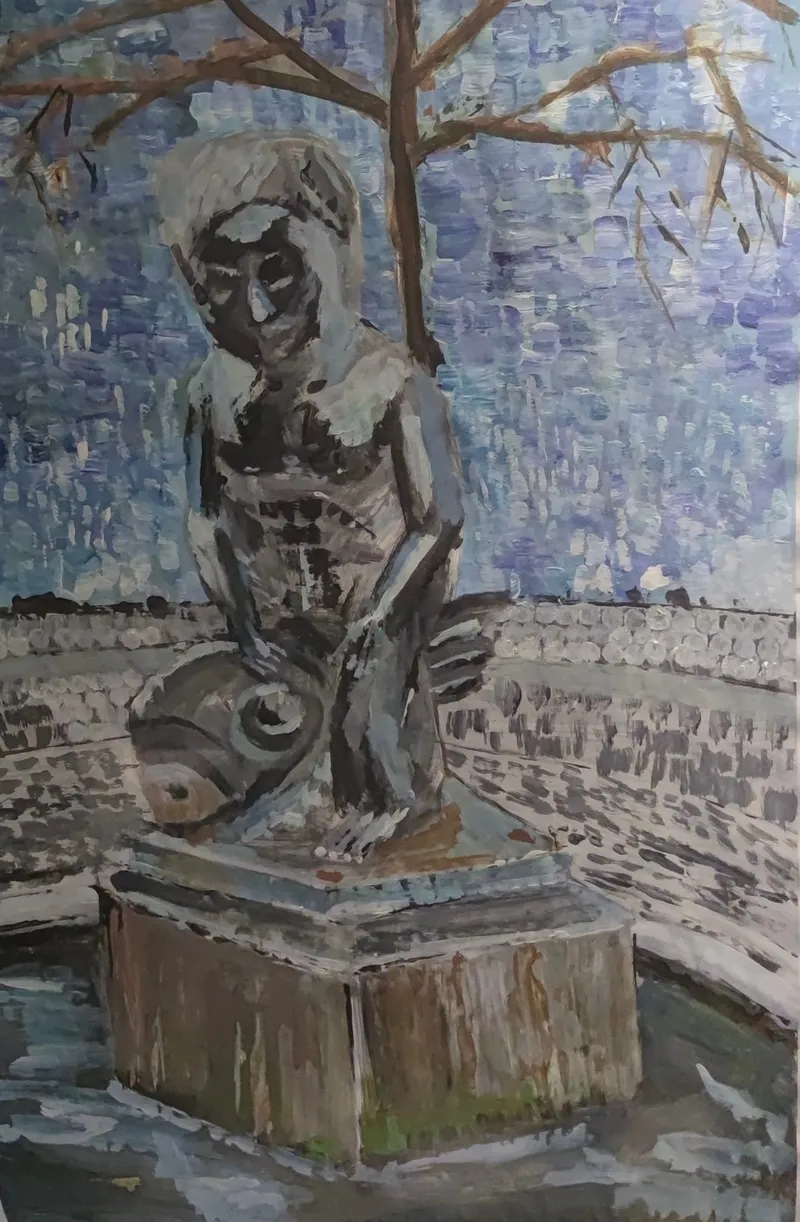 Die Figur beugt sich über einen Fisch, was für mich eine leise Anspielung auf mythologische Brunnenmotive ist. Gleichzeitig sehe ich darin eine Geste der Reflexion – ein Innehalten. Die Statue wird so zu einer Metapher für Erstarrung, aber auch für Bewusstsein: ein Moment, in dem man innehält und sich selbst begegnet.