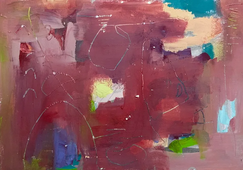 In „Zwischen den Worten“ (2025) öffnet sich für mich ein Raum, der wie eine leere, bereits beschriebene Seite wirkt – ein Ort, an dem der Text verschwunden ist, die Emotion jedoch geblieben ist. Ein tiefes Rot-Violett bildet den Grund: ein dichter, körperlicher Farbraum, der trägt und zugleich verschluckt.